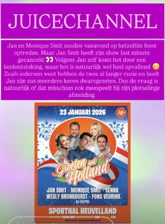 Jan Smit heeft namelijk een optreden afgezegd, omdat Monique Smit toevallig daar ook moet optreden voor of na Jan Smit op een Festival. Je gaat immers niet zomaar 10.000 over de balk smijten en mensen teleurstellen, omdat je zus daar ook is. Dan heb je wel knallende ruzie met elkaar. En dat komt dus van Jan Smit. Niet van Monique. Die heeft immers niet afgezegd. Dat meldt Juice Channel.
