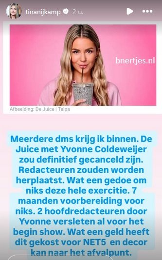 In het programma Vandaag Inside had Johen Derksen met John de Mol gesproken omtrent het programma De Juice, wat op Net 5 op de buis moet komen. Een paar dagen geleden meldde Tina Nijkamp dat het programma waarschijnlijk niet doorgaat. Nu is er een update. Het programma De Juice gaat waarschijnlijk wel door, maar dan zonder Yvonne Coldeweijer. Achter de schermen zijn ze helemaal klaar met haar, aldus Johan Derksen van John de Mol. John de Mol wil op Net 5 een soort van Shownieuws om jonger publiek te trekken. Daarom heeft hij voor Juice gekozen. Niet voor Yvonne Coldeweijer. En Yvonne Coldeweijer wordt dus waarschijnlijk aan de kant gezet. Al is dat nog niet naar buiten gekomen. Het is misschien niet leuk voor haar. Maar als zij de boel in haar greep houdt en moeilijk mee samen te werken valt (2 eindregisseurs en Maxime Meiland) die opgestapt zijn, moet je niet een programma af laten hangen van 1 persoon. Overigens vindt deze het gewoon vreemd. Ze is gewoon een werknemer van Talpa. Dan moet je toch doen wat de baas zegt. Dan kan je toch niet je eigen rechter spelen.